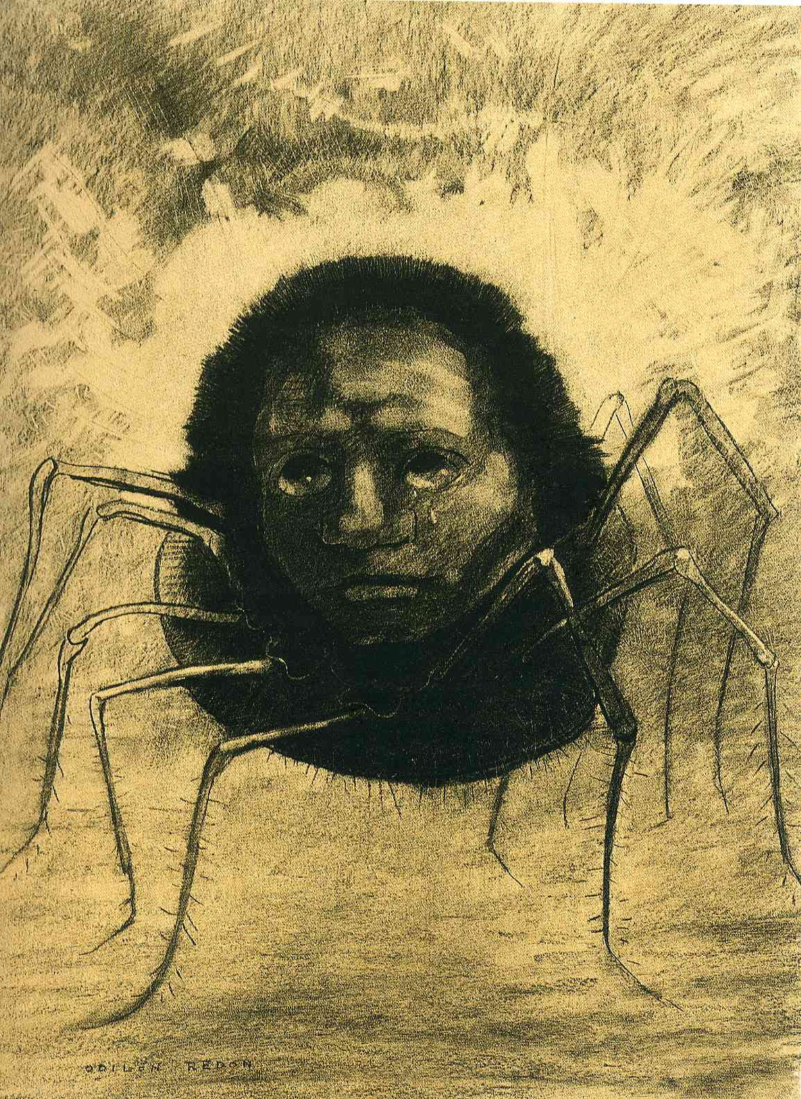 르동은 이때부터 ‘누아르’(Noir)로 불리는 검은 그림들을 본격적으로 그리기 시작했다. 악몽에서 막 튀어나온 듯한 괴물, 눈알 풍선, 우는 거미, 황폐한 풍경. 흑백만 썼다. “꿈과 상상의 세계는 어둠에서 나오니 흑백으로도 충분하고, 색을 써봤자 눈만 어지러워질 뿐”이라는 판단이었다.